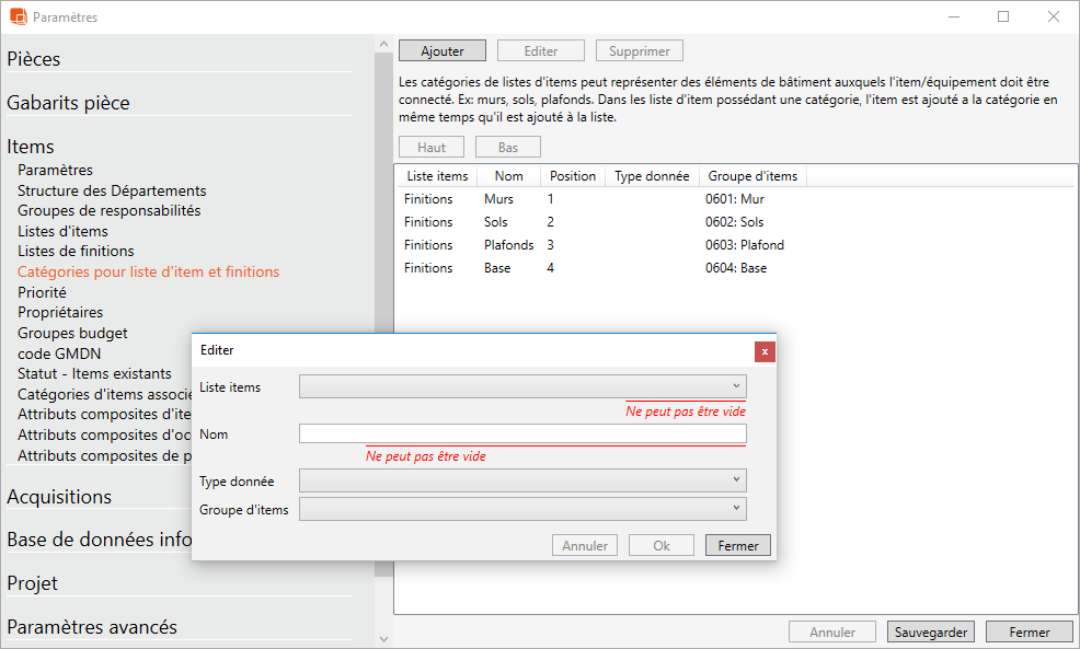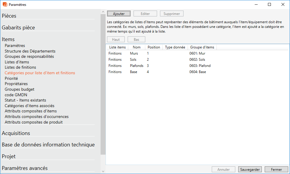 Créer des catégories dans la liste des équipements de finitions (super-utilisateur)