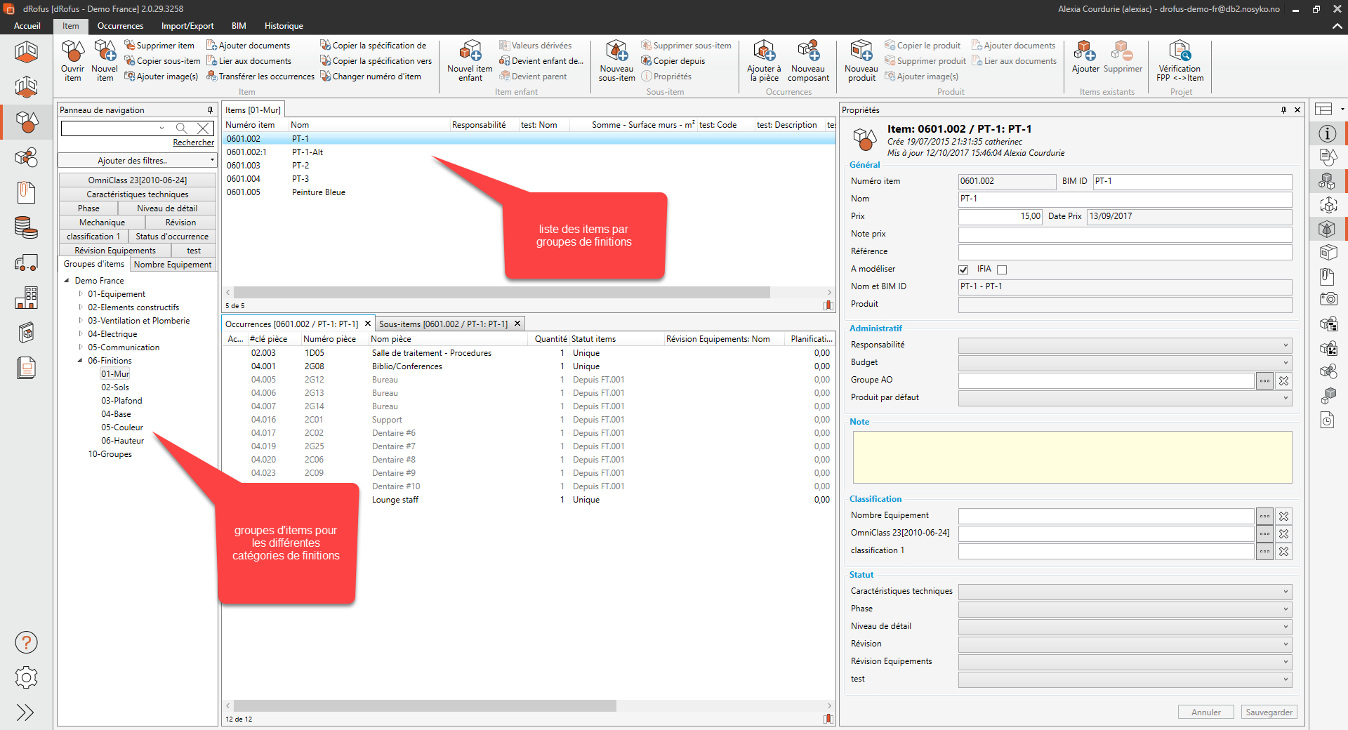 Il est à noter que l'image ci-dessus représente un exemple de la manière dont les finitions peuvent être classées. Les projets peuvent toutefois classer les groupes de finitions différemment. De nouveaux items de finitions peuvent être créés en cliquant sur "N ouvel Item" dans l'angle supérieur gauche du menu du haut.Pour créer une liste d'équipements de finitions, il vous faut un accès en tant que super-utilisateur à la base de données. Les deux paragraphes suivants sont destinés aux personnes qui créeront le cadre destiné à l'enregistrement des finitions dans dRofus.