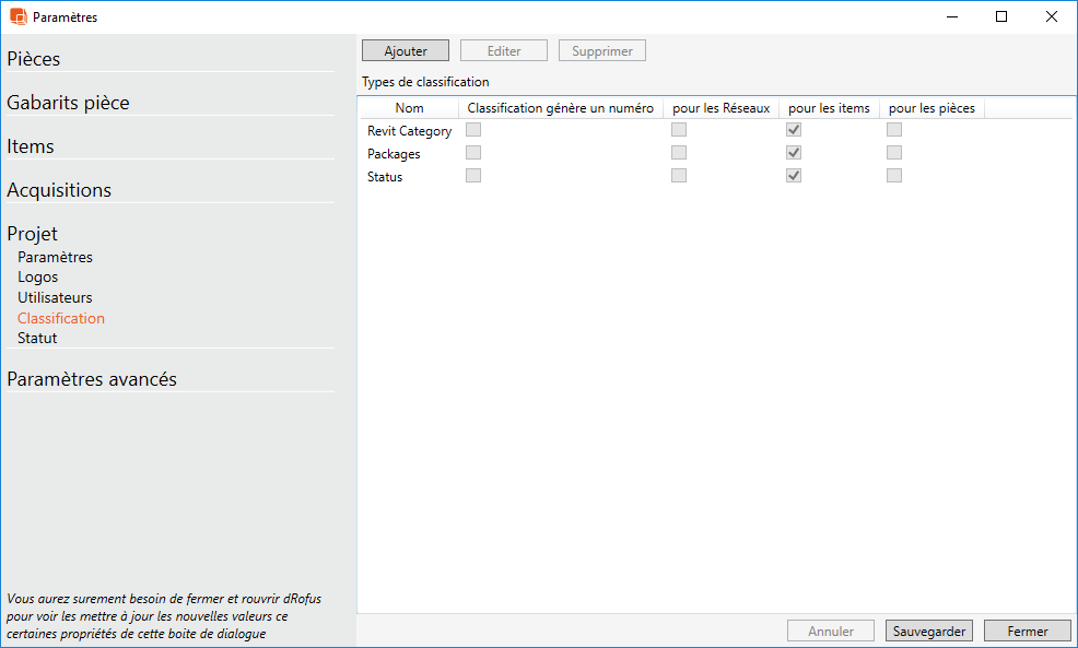 Pour ajouter une classification, aller à Administration->Paramètres->Projet->Classification