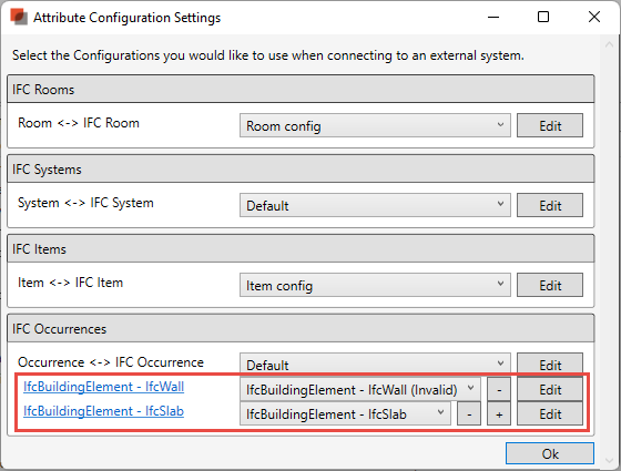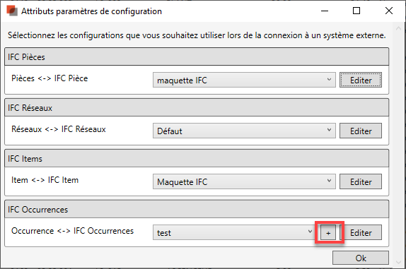 Dans le cas de la configuration Occurrence <-> Occurrence IFC, vous noterez qu'il y a un bouton "+" disponible à droite pour le nom de la configuration ;