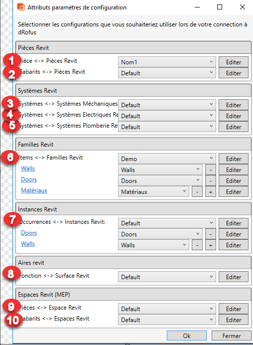 - Spécifiez et lier les paramètres Revit qui doivent placer leurs données dans les attributs dRofus lors de la synchronisation pour les pièces, les espaces, les réseaux, les types de familles, les instances de familles ou les zones liées et