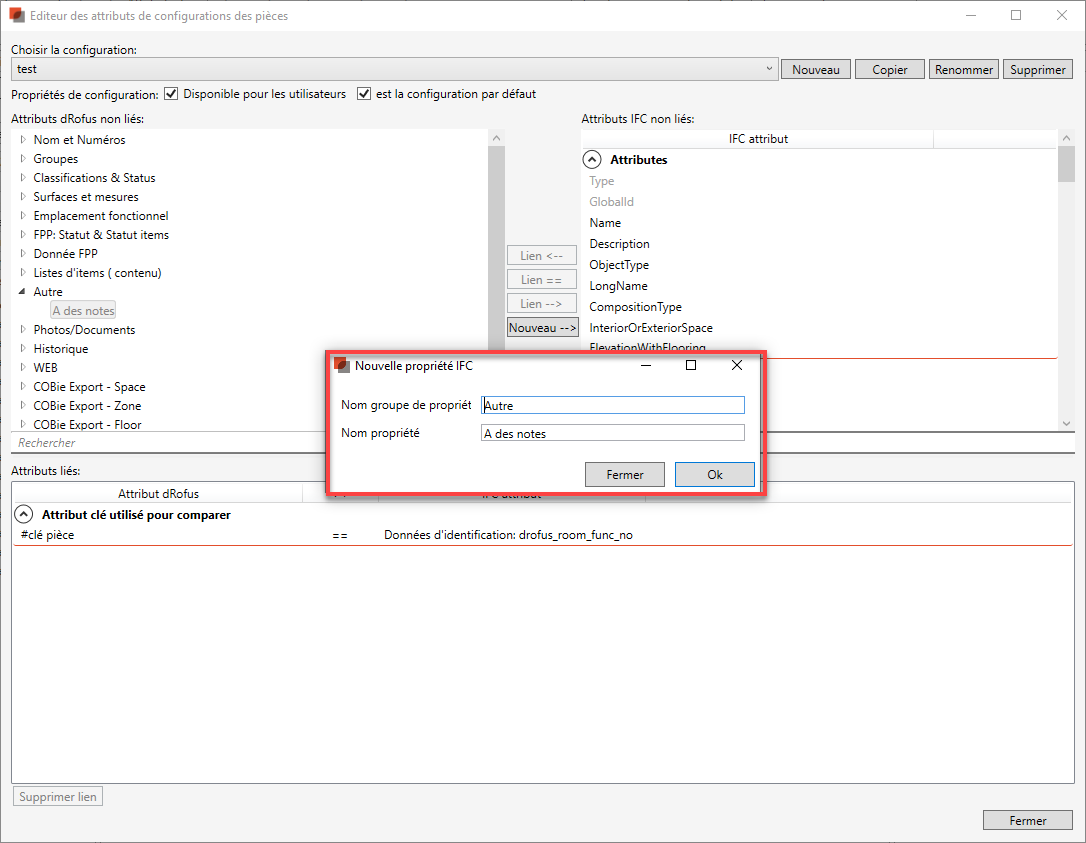 The following dialoLe dialogue suivant apparaîtra alors pour (par exemple) la configuration Pièce <-> Pièce IFC :