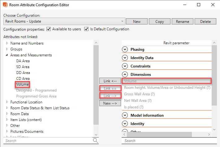- Revit Calculated Parameters: The half-toned Parameter / buttons below indicate that the Revit Parameter called "Volume" is a Calculated Parameter and, as such, cannot be written to - i.e., "Link -->" is not possible. It also suggests that becaue this value can keep changing, it cannot be used as the key attribute for comparing - i.e., "Link ==" is not possible: