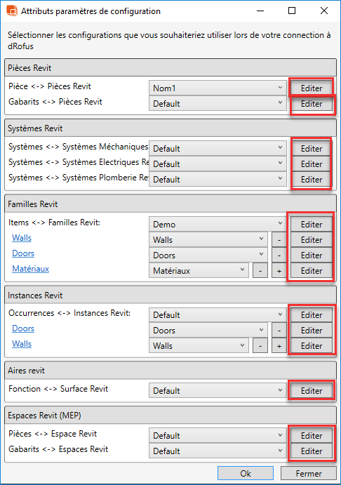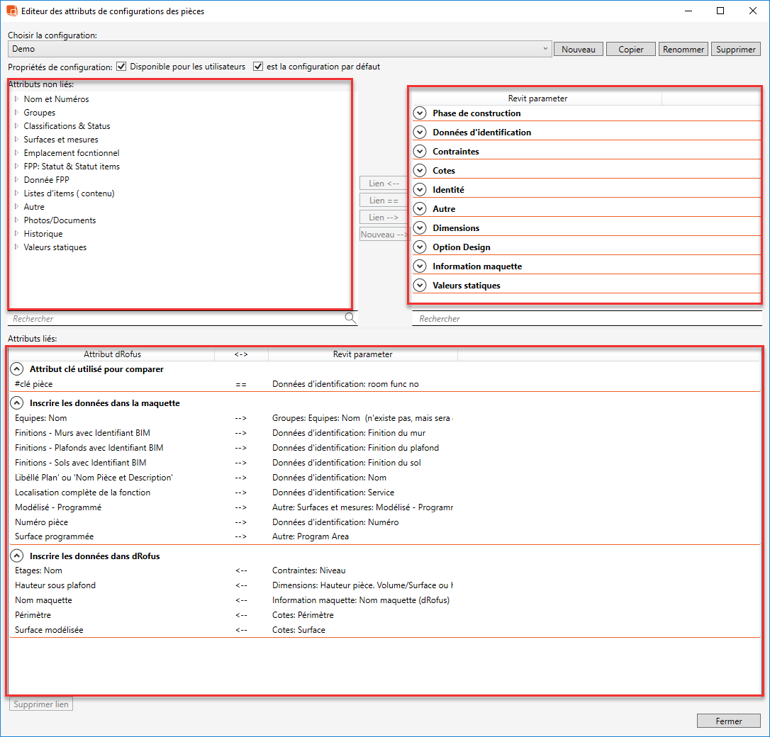 Le dialogue suivant apparaîtra alors pour (par exemple) le type de configuration Pièce <-> Pièce Revit: