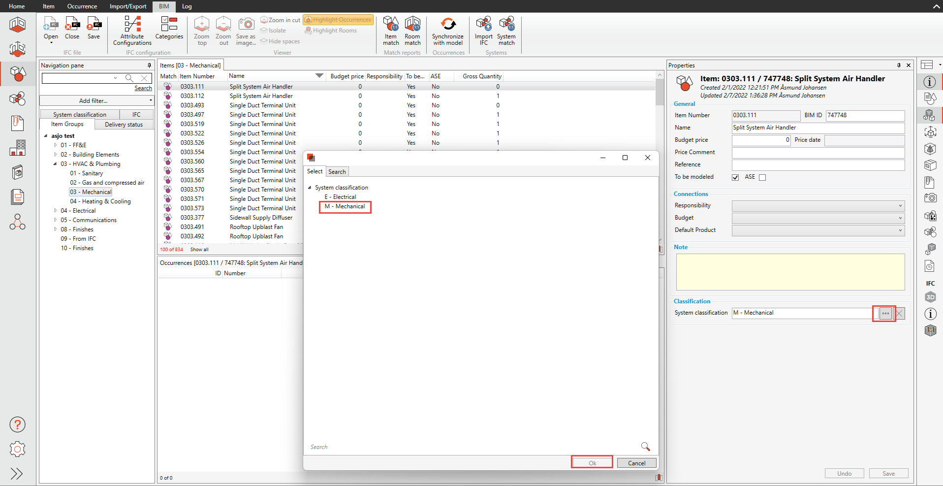 Lorsque les items sont créés à partir du fichier IFC ( Create Items in dRofus ), vous pouvez commencer à les classer. Dans l'exemple ci-dessous, nous avons créé une structure de classification simple avec deux groupes, E - Électrique et M - Mécanique.