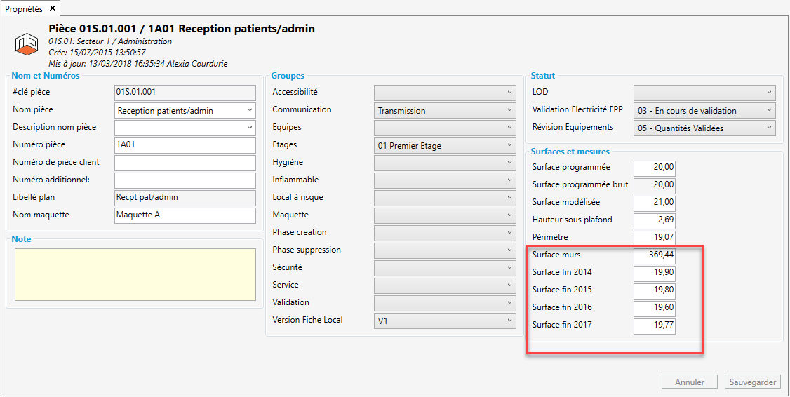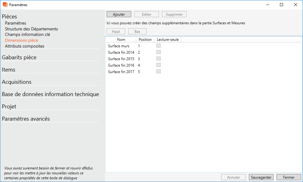 Permet de créer des dimensions en plus pour vos pièces. Elles apparaîtront dans la partie " surface et mesures" de l'info clè pièce. Comme l'exemple ci-dessus, vous pouvez également décider de bloquer ces champs. Idéalement cela permet de "geler" des surfaces à certaines étapes clés du projet.