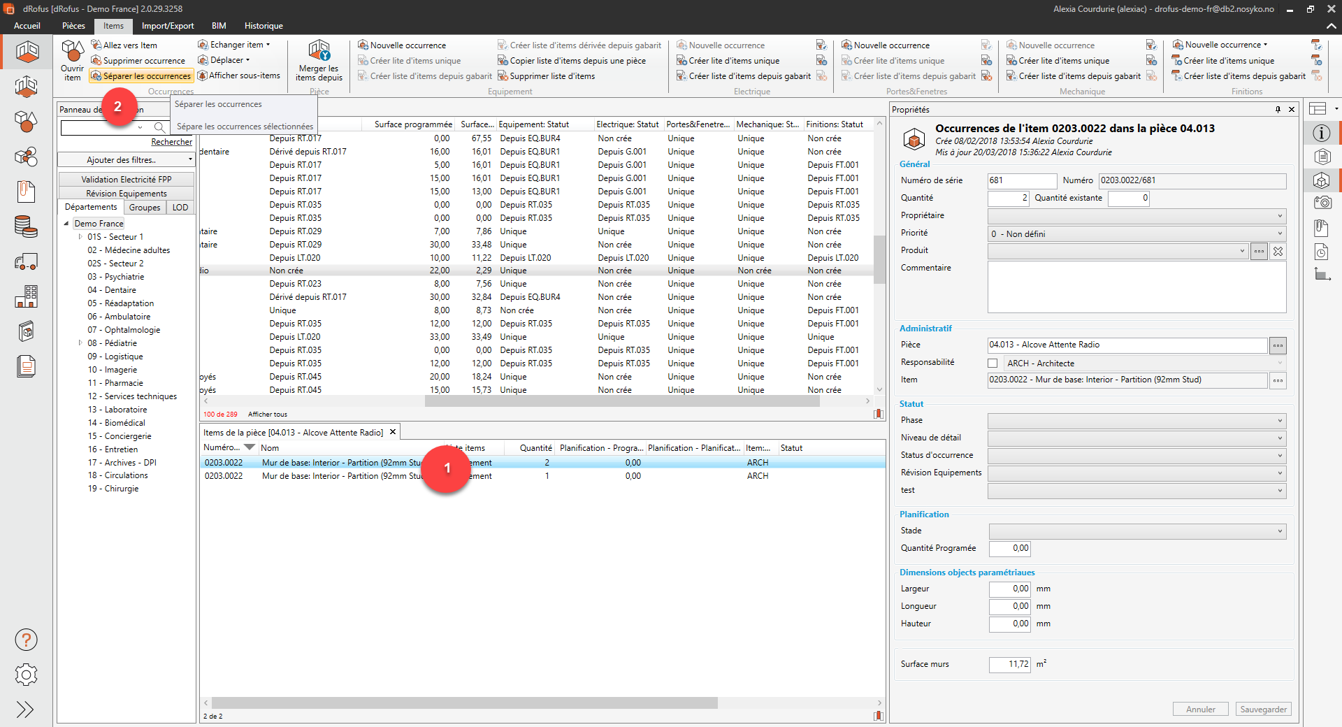En cliquant droit sur un item avec des multiples quantités (1) : les occurrences peuvent être divisées en occurrences individuelles (2):