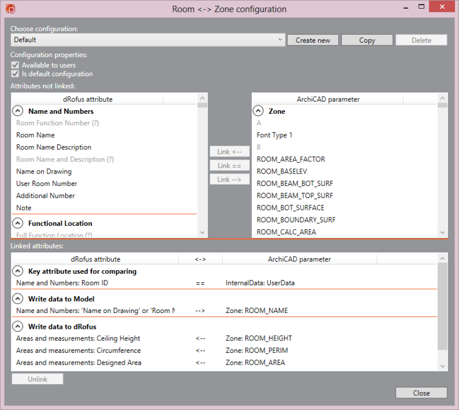 "Rattacher ==" Crée un élément principal pour la configuration. Chaque configuration doit impérativement avoir un élément principal (et un seul). Une valeur principale est tirée de dRofus et rédigée pour ArchiCAD, sauf si le paramètre ArchiCAD est en lecture seule ou si le paramètre dRofus est vide.