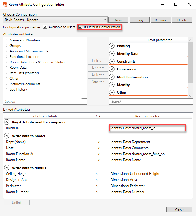 Dans l'exemple suivant, "Identity Data : drofus_room_id" est le paramètre de Revit utilisé comme "Attribut clé de comparaison" dans la configuration par défaut :