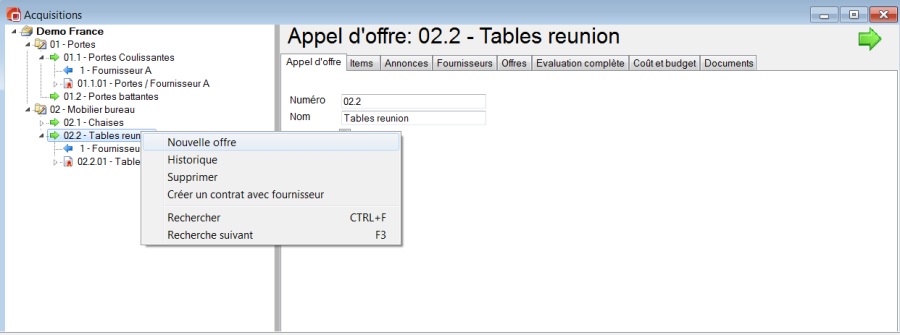 Pour enregistrer une proposition, faites un clic droit sur l'appel d'offres correspondant et sélectionnez Créer une nouvelle proposition. Ensuite, sélectionnez le fournisseur qui a envoyé l'offre et cliquez sur OK.