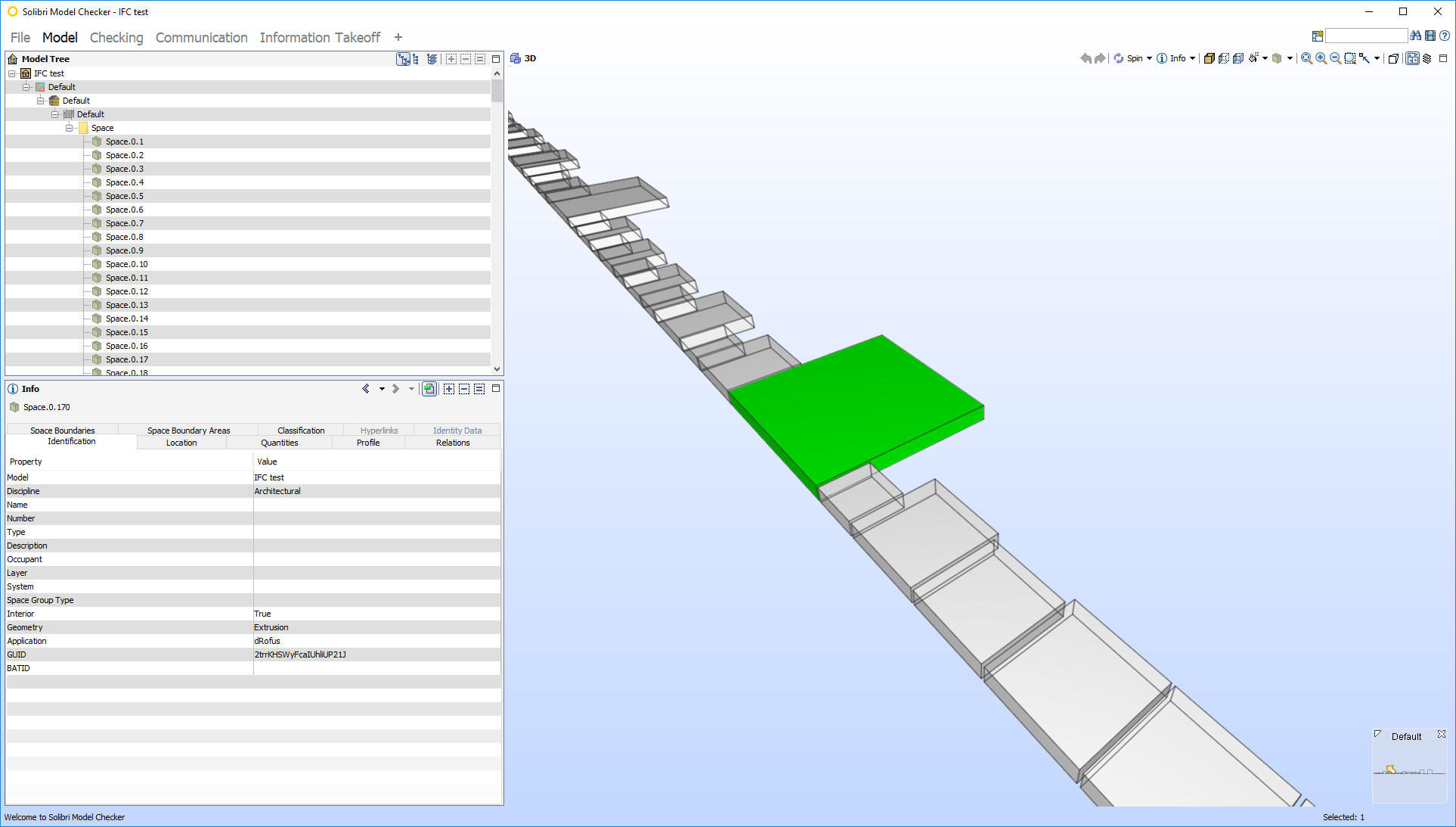 L'export utilisera la configuration par défaut. Les pièces seront exportées sous forme d'espace IFCS qui peut être importé dans des applications d'architecture prenant en charge l'import d'IFC et utilisé comme entrée pour réaliser des projections.