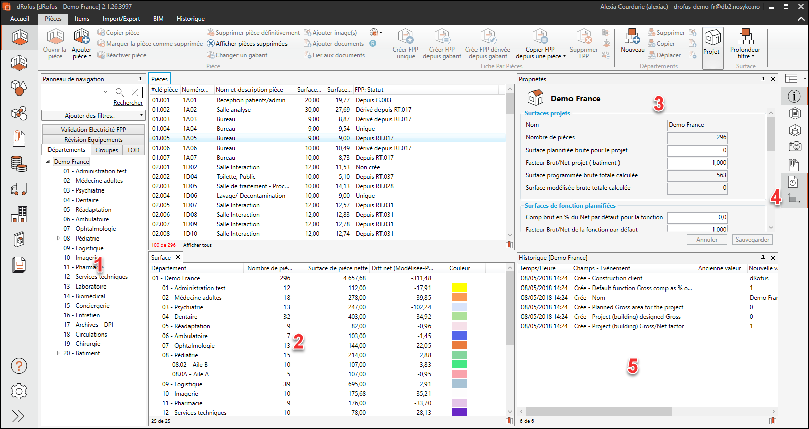Toutes les modifications apportées aux informations du projet dans dRofus sont consignées et peuvent être affichées dans l'historique du projet. Pour afficher l'historique du projet, accédez au module de pièce et sélectionnez le niveau supérieur de votre structure de fonctions (1) ou le niveau supérieur (projet) dans le panneau Zones (2). Vous devriez maintenant voir les informations sur le projet dans le panneau des propriétés (3). Lorsque vous voyez les informations du projet dans le panneau des propriétés, vous verrez l'historique de ces informations en sélectionnant pour afficher l'historique (4) - le panneau Historique s'ouvrira avec des informations sur le projet (5).