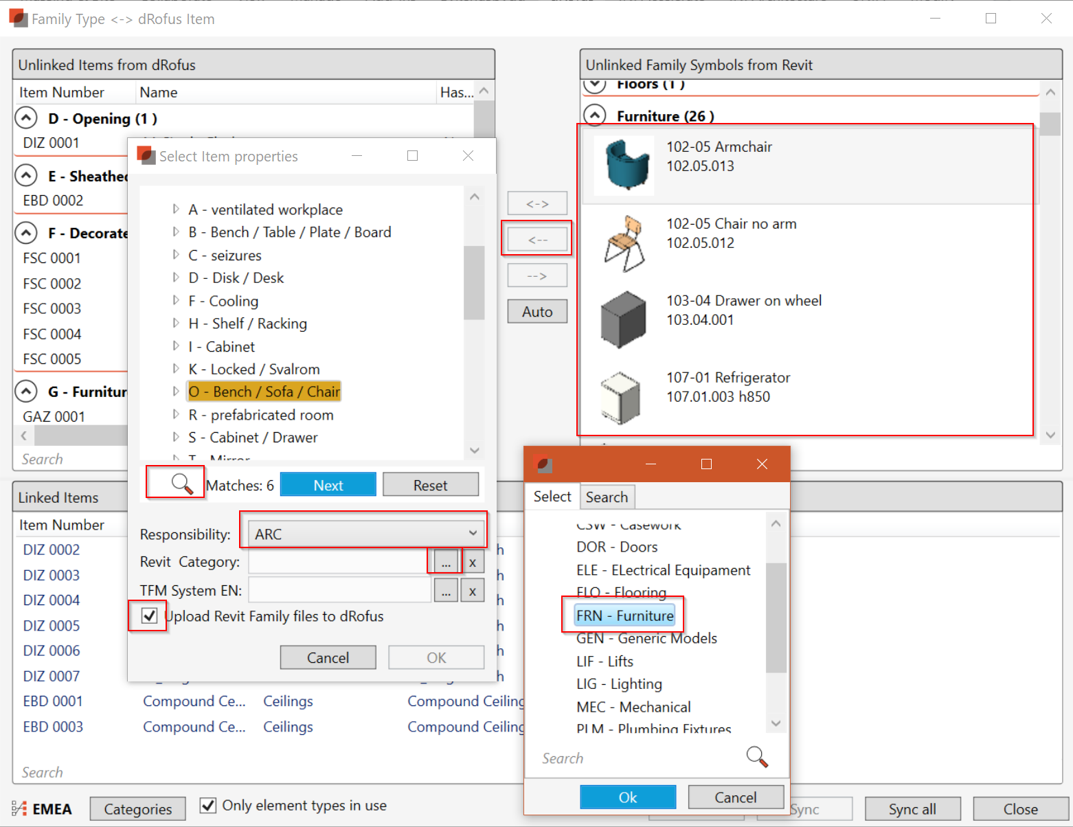 S'il y a des types de famille Revit pour lesquels les items dRofus correspondants n'existent pas, sélectionnez le(s) type(s) de famille Revit dans la partie droite (vous pouvez multi-sélectionner des items similaires en utilisant les touches "Shift" et / ou "Control" de votre clavier) et sélectionnez le bouton "<--". Vous pouvez également rechercher des groupes d'items lorsque vous ajoutez de nouveaux items à partir de Revit. Une fois que vous avez désigné l'emplacement dans la structure du groupe d'items dans dRofus et que vous avez attribué la responsabilité ainsi que l'option de choisir de "Télécharger les fichiers de la famille Revit vers dRofus", vous êtes également en mesure de mapper le ou les nouveaux items dRofus à des valeurs de Classification spécifiques. Dans l'exemple suivant, une classification appelée "Catégorie Revit" a été configurée. Cliquez sur "OK", et les items seront alors créés dans dRofus :