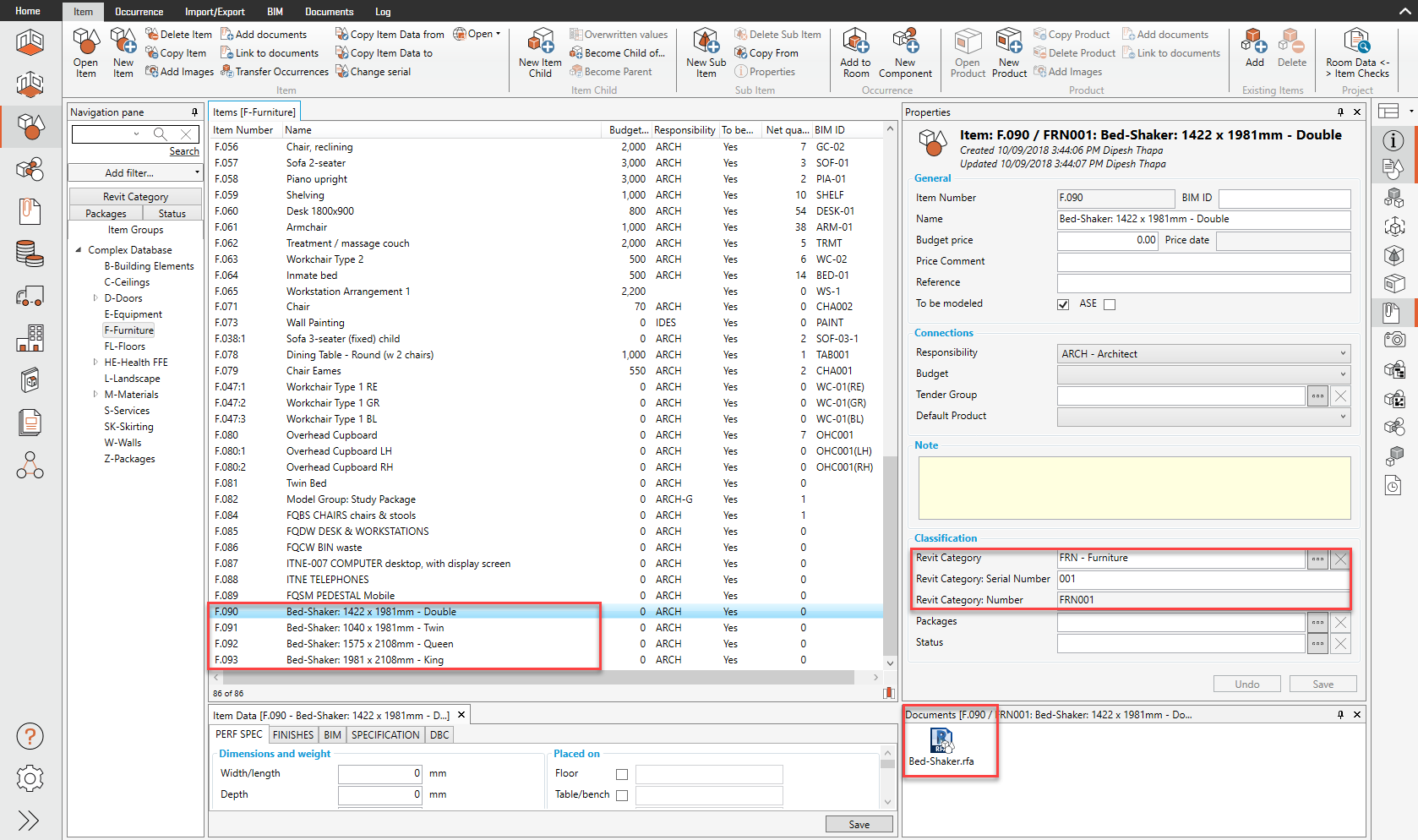 Dans cet exemple, 4 x nouveaux items ont été créés dans dRofus sous le groupe d’items "F-Furniture", qui ont tous été associés à la valeur de classification "FRN - Furniture". Des fichiers de famille ont également été téléchargés (en tant que documents) pour chacun de ces items, comme indiqué ci-dessous :