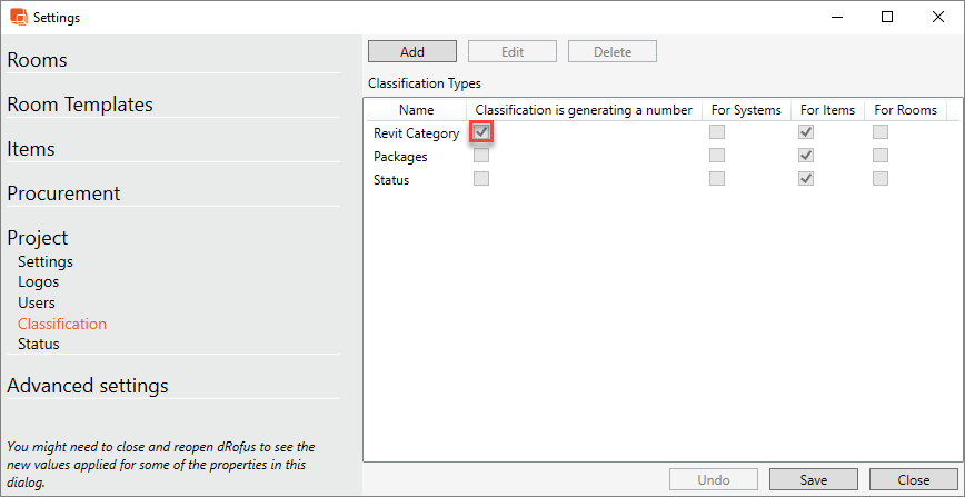 Le mappage des items dRofus aux valeurs de classification (au moment de l'import dans dRofus) est possible à condition que la classification ait été configurée en cochant la case "La classification génère un numéro" :