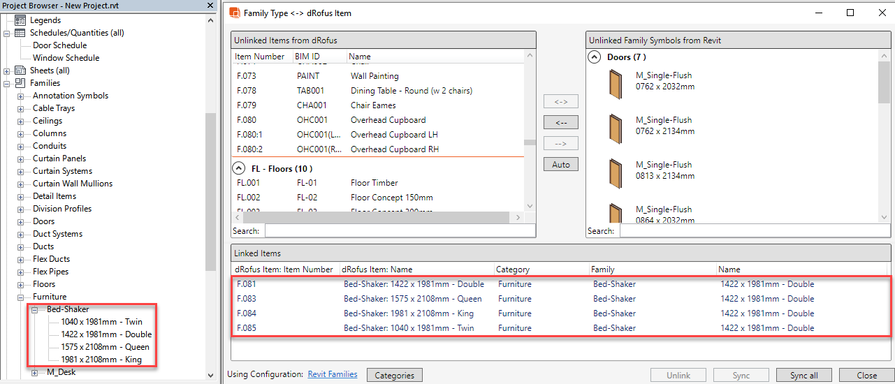 Choisir "Charger les fichiers famille Revit sur dRofus" est particulièrement utile s'il existe un autre projet Revit (utilisant la même base de données dRofus) et que vous devez charger ces mêmes types de familles dans l'autre projet Revit. Une fois que vous avez ouvert l'autre projet Revit ("Nouveau projet"), vous pouvez ensuite parcourir ou rechercher puis sélectionner un item dRofus (qui a été téléchargé avec le fichier Revit Family correspondant du projet Revit original) sur le côté gauche, puis cliquer sur "->":