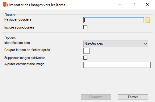 Vous pouvez importer des images vers l'Item en sélectionnant Accueil->Items→ rapport/Export -> Importer des images vers des Items. Vous devez avoir vos images dans un dossier que vous sélectionnez à l'aide de l'icône du navigateur. Si le dossier contient des sous-dossiers, cochez la case "Inclure les sous-dossiers". Les images doivent être nommées par le Numéro d'Item, le Nom, l'Identifiant BIM ou par la Référence. Vous devez donc nommer vos images comme ceci (si vous utilisez le Numéro d'Item comme identifiant) : 01.01.001.doc.