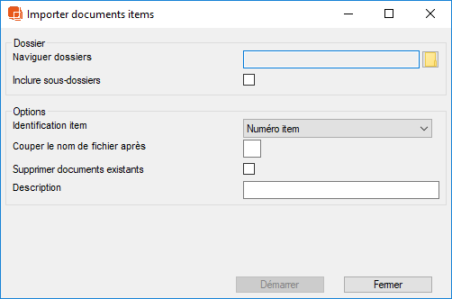 Vous pouvez importer des documents vers l'Item en sélectionnant Accueil->Items→ rapport/Export -> Importer les documents d'Items. Vous devez avoir vos documents dans un dossier que vous sélectionnez à l'aide de l'icône du navigateur. Si le dossier contient des sous-dossiers, cochez la case "Inclure les sous-dossiers". Les documents doivent être nommés par le Numéro d'Item, le Nom, l'Identifiant BIM ou par la Référence. Vous devez donc nommer vos documents comme ceci (si vous utilisez le Numéro d'Item comme identifiant) : 01.01.001.doc.