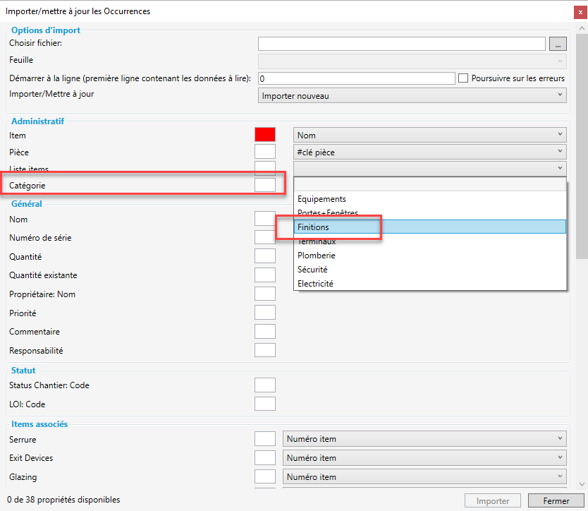 Vous pouvez importer les données de finitions à la fois des gabarits de pièces et des pièces en allant à Pièces→Import/export → Importer/Mettre à jour les items dans pièces.
