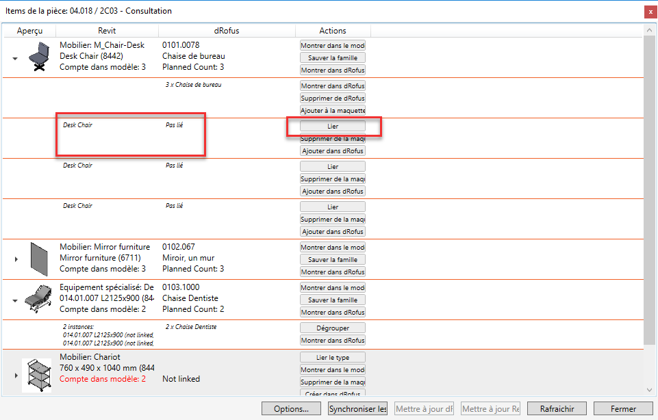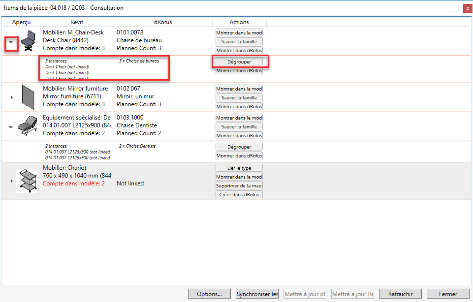 En cliquant sur les petits triangles (en surbrillance) dans la fenêtre Éléments dans la pièce, vous pouvez développer la ligne (représentant un seul type / item de famille) pour afficher toutes les occurrences pour ce type particulier placé dans la maquette et / ou plannifiés dans dRofus. Les items peuvent être liés / appariés ou non. Si les items sont liés / correspondent, les deux instances placées dans la maquette ainsi que les occurrences prévues dans dRofus sont situées sur la même ligne. Il est possible de dissocier les instances appariées / non concordantes en sélectionnant le bouton "Dissocier" dans la rangée groupée. Cela permet de synchroniser ces éléments individuels et de corriger toute non-concordance de quantité en modifiant la quantité des occurrences de famille placées ou des occurrences d'élément planifiées:
