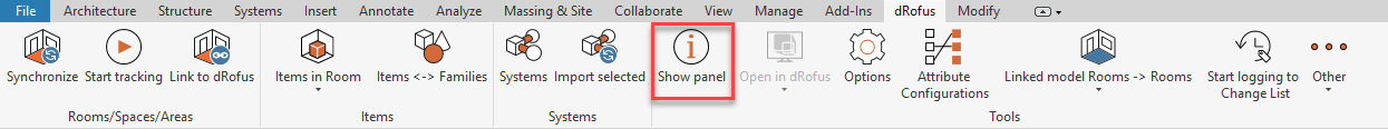 Dans le ruban dRofus, sélectionnez le bouton "Afficher le panneau" pour activer le panneau dRofus :
