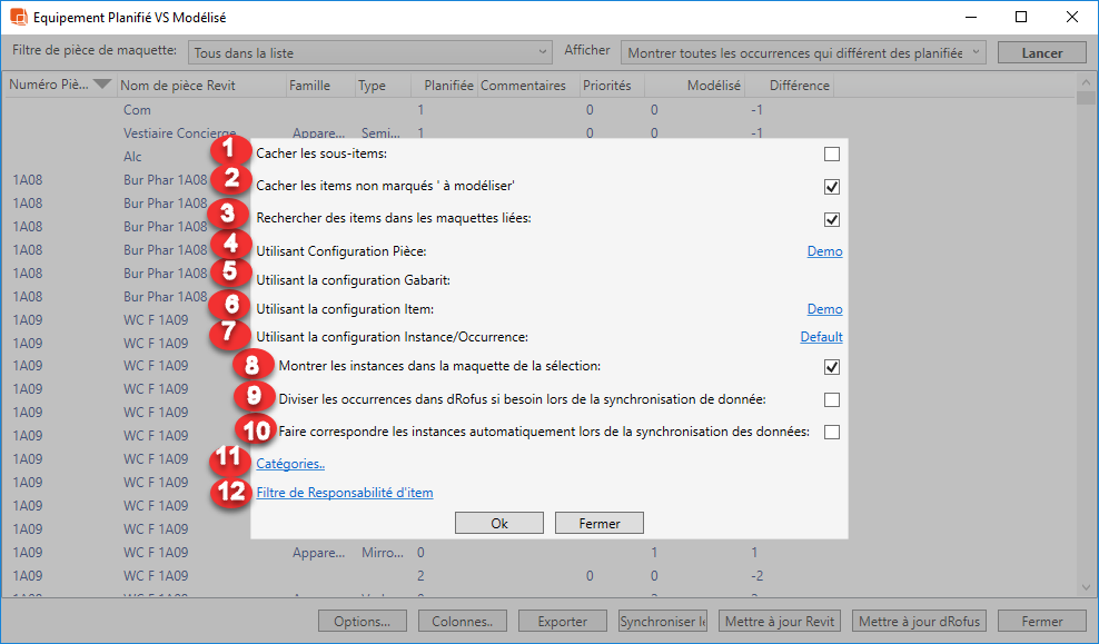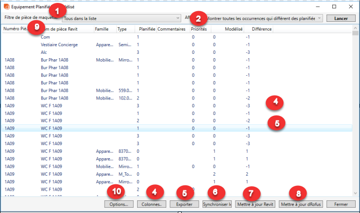 - Affiche les occurrences qui diffèrent de ce qui est plannifié: Répertorie uniquement les occurrences Revit instances / dRofus en cas de divergences.