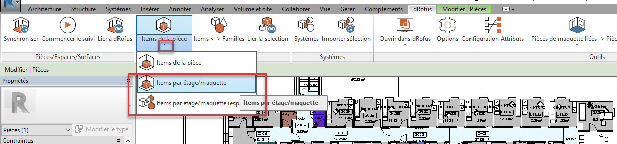 Items dans plusieurs pièces sélectionnées ou par Niveau Revit ou par Maquette Revit