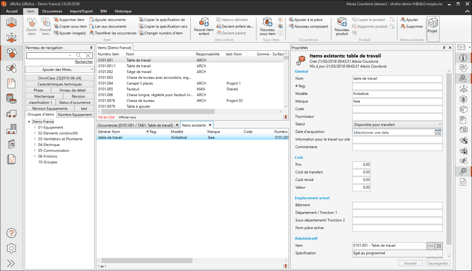 Le registre des articles existants peut être ouvert à partir de la liste Accueil → Items → Equipements existants icone dans le menu de droite.