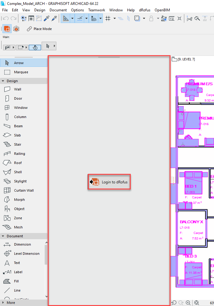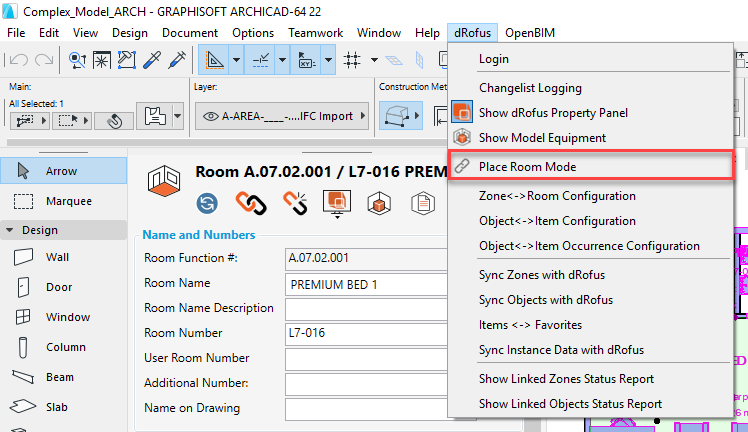Ce ruban flottant ou ancré n'apparaît pas automatiquement la première fois que vous exécutez ArchiCAD. Vous devrez l’engager explicitement en cliquant sur Mode Placer Pièces dans le menu déroulant dRofus: