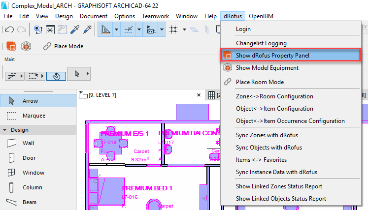Ce panneau n'apparaît pas automatiquement la première fois que vous utilisez ArchiCAD. Vous devrez l’engager explicitement à l’aide du menu déroulant dRofus.: