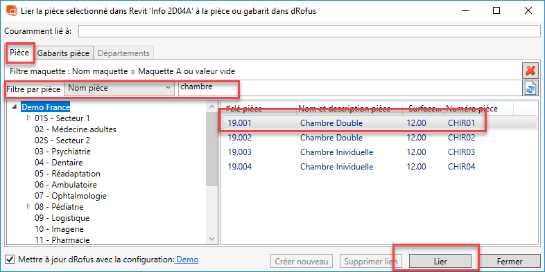 - Recherchez et sélectionnez la pièce dans dRofus à laquelle vous voulez connecter la pièce Revit (en utilisant l'option 'Filtre Pièce' et / ou naviguez dans la structure de fonction sur le panneau de gauche), puis sélectionnez "Lier":