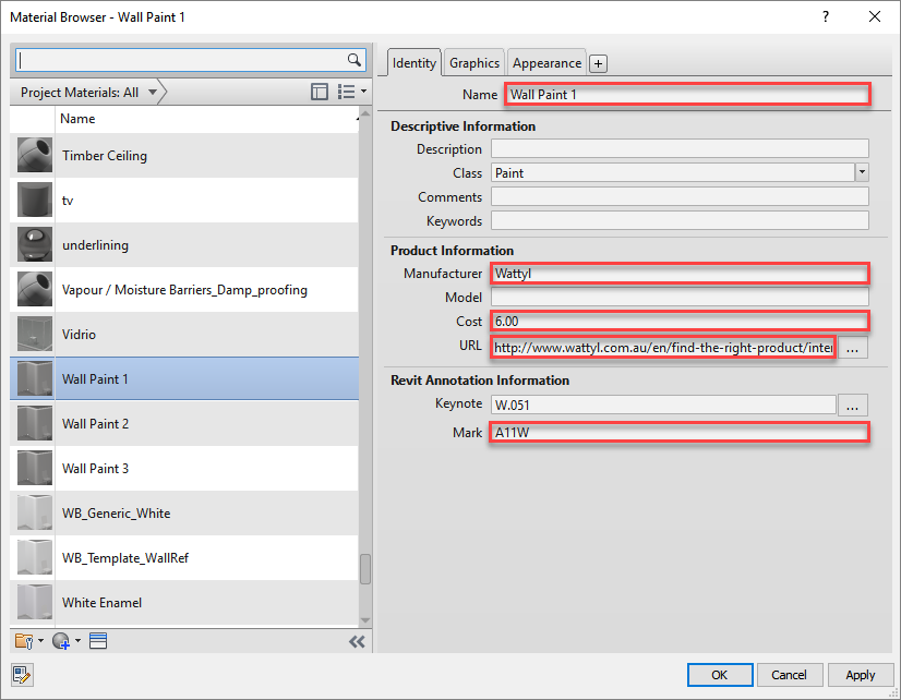 La liaison de matériaux à des items de finition fonctionne de la même manière que lier des types de familles à des items (expliqué dans Liaison de types de familles Revit à des items).