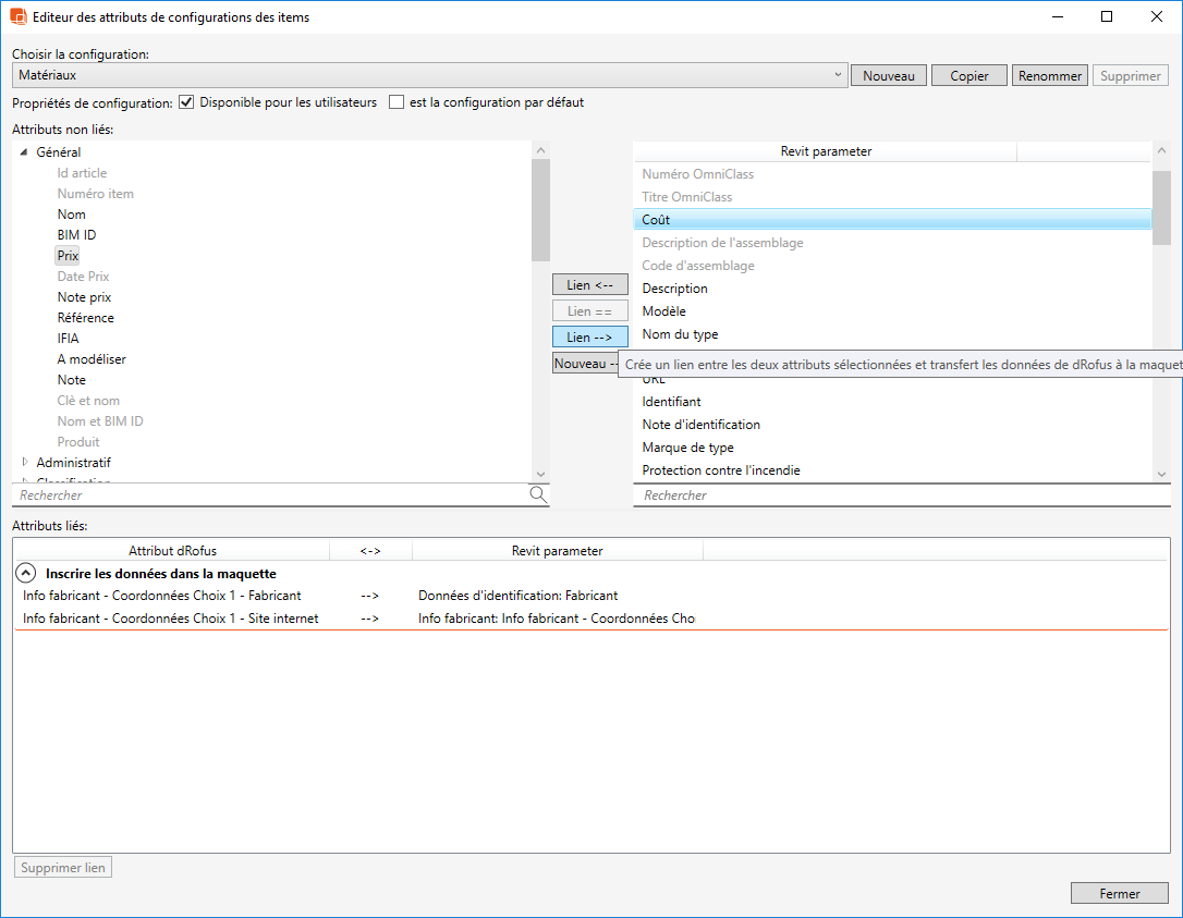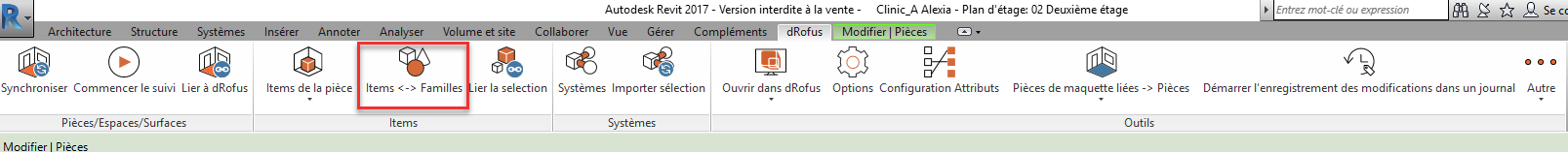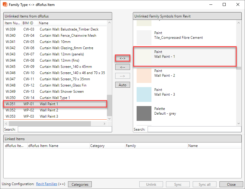 Vous pouvez ensuite lier votre item Finitions dans dRofus à un item dans Revit en sélectionnant "Items <-> Familles":