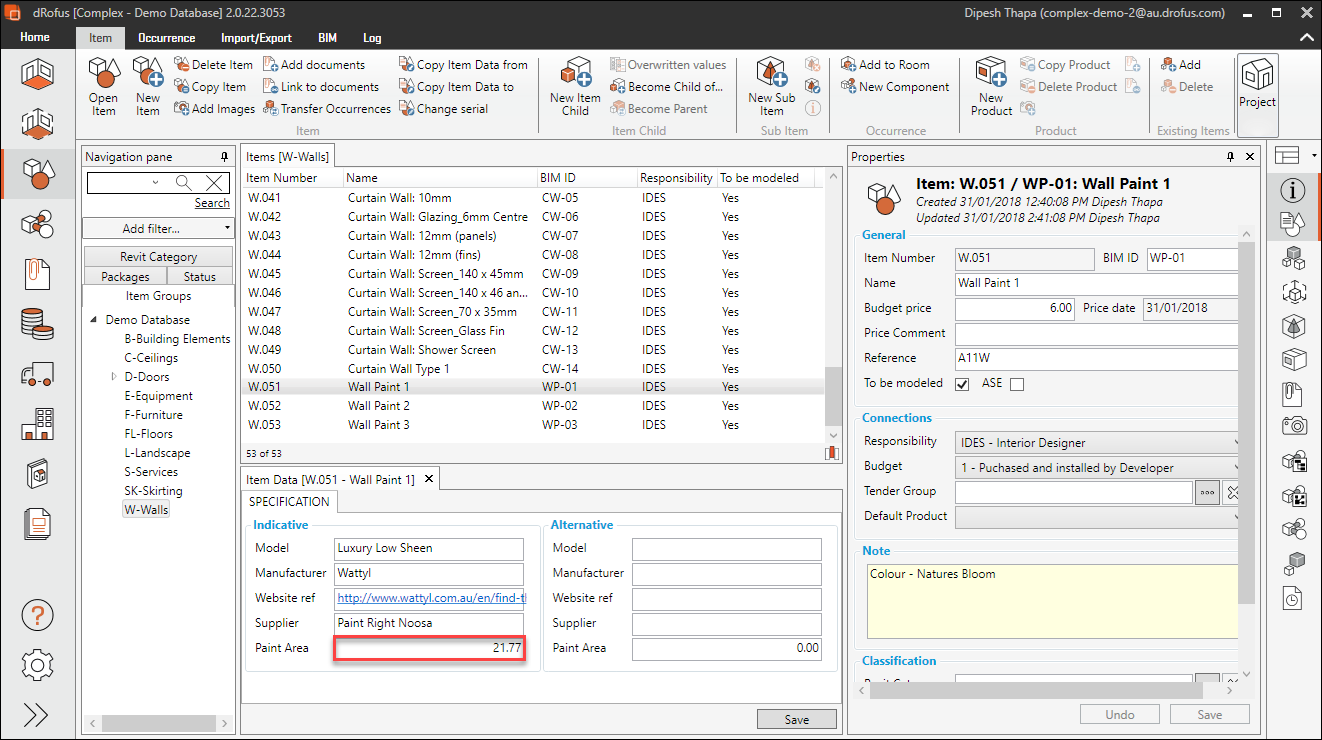 Si vous ne l'avez pas déjà fait, vous pouvez maintenant commencer à entrer des données dans dRofus pour vos items finition, par exemple "Peinture murale 1".