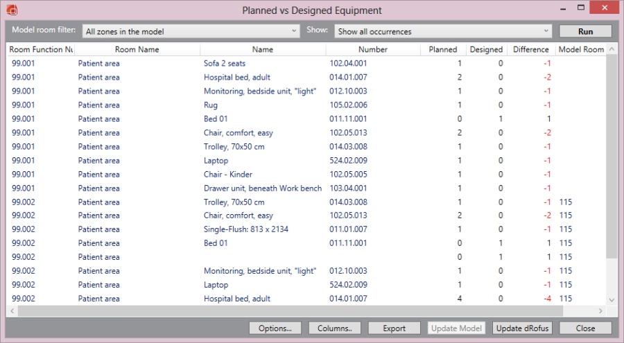 Depuis cette fenêtre, vous pouvez à la fois examiner, exporter et corriger les écarts. Vous pouvez faire un clic droit sur une ou plusieurs occurrences dans la liste et effectuer des actions et des mises à jour. Vous pouvez également choisir de mettre à jour toutes les occurrences dans la liste, en utilisant le bouton 'Mettre à jour dRofus' situé au bas de la fenêtre.