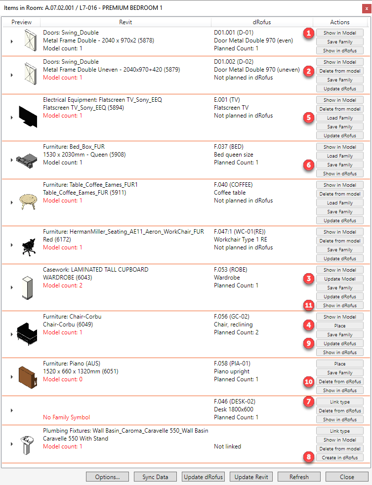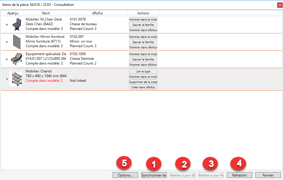 Les options suivantes (numérotées ci-dessus) sont disponibles en fonction du statut des occurrences Revit et des occurrences dRofus: