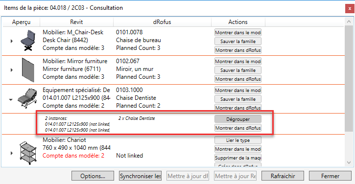 Dégrouper: Divise les occurrences dRofus en deux ou plusieurs lignes séparées.