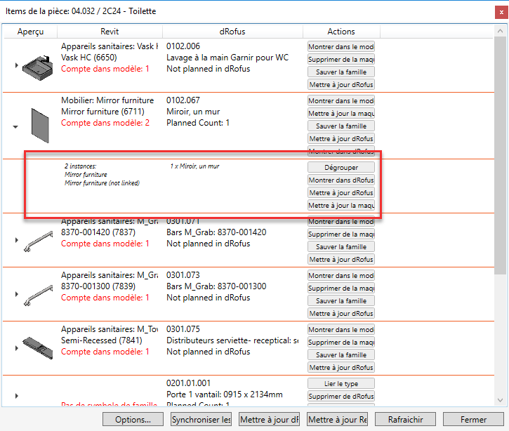 - Montrer les occurrences qui differrent des plannifiées: Répertorie uniquement les occurrences Revit instances / dRofus en cas de divergences.