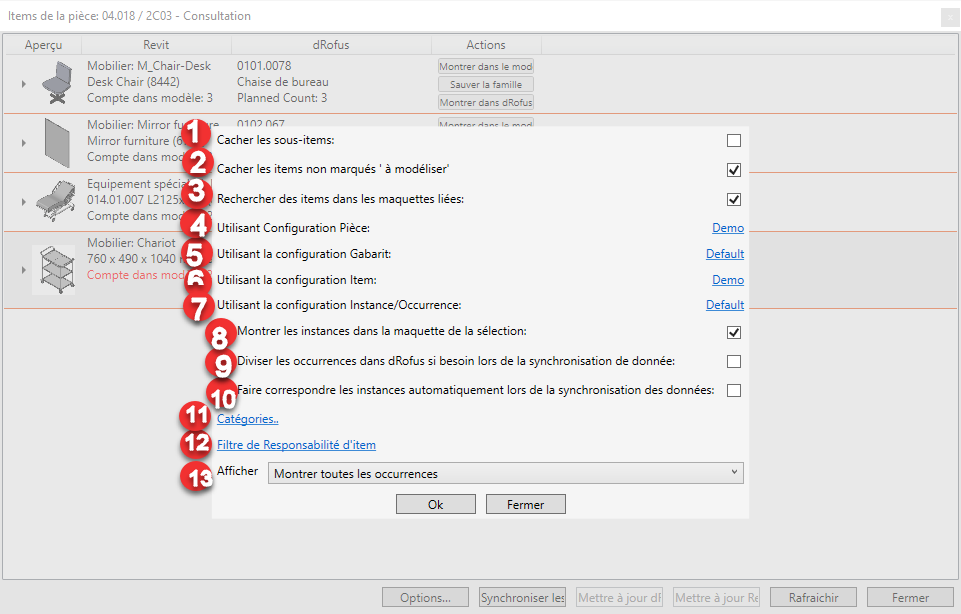 - Montrer toutes les occurrences: Répertorie toutes les occurrences Revit instances / dRofus en tant qu'items .