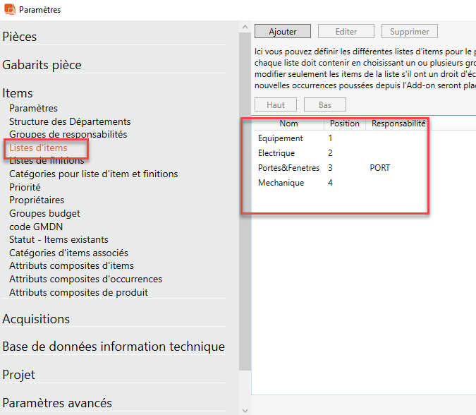 Vous pouvez associer des responsabilités à chacune des listes, c'est-à-dire que dans notre exemple, la liste d'équipements aura une responsabitilé ARCH pour les architectes. Cela évite de mélanger les items dans la mauvaise liste d'équipement. Si vous ne définissez pas de responsabilité à une liste, n'importe quel item peut y être ajouté.