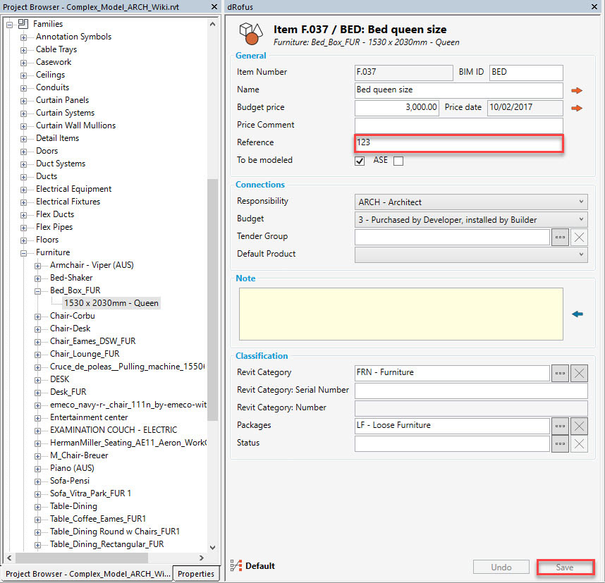 Dans l'exemple suivant, si la valeur de référence de dRofus est modifiée de <blank> à "123" et que l'on clique ensuite sur "Enregistrer" :