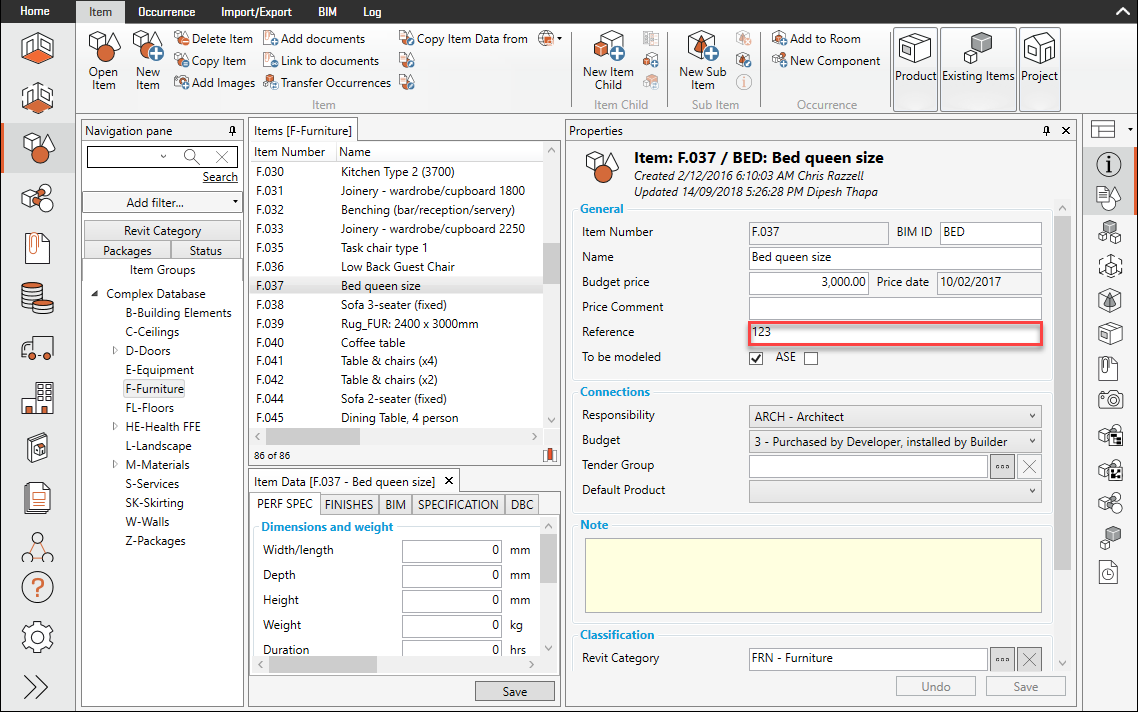Il est possible d'apporter des modifications aux valeurs de toutes les propriétés de litem dans le panneau dRofus. Il n'est donc plus nécessaire de modifier le type d’item dans le client dRofus pour effectuer des changements spécifiques au type d’item.