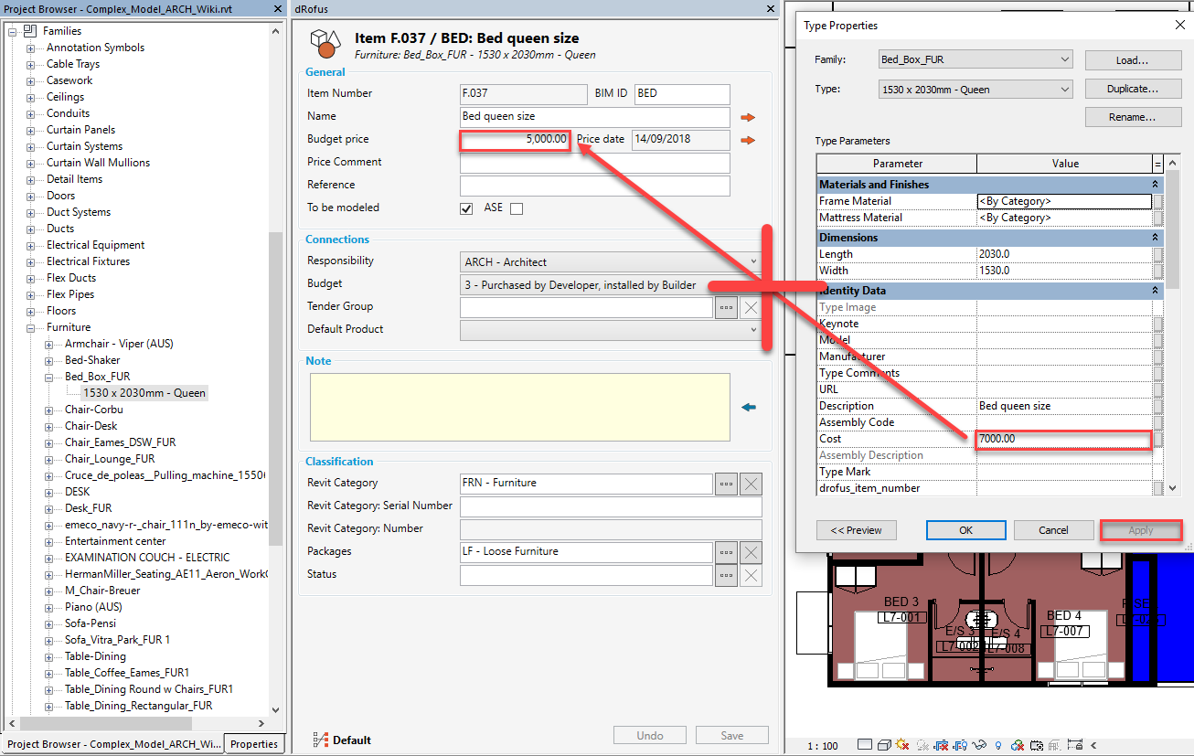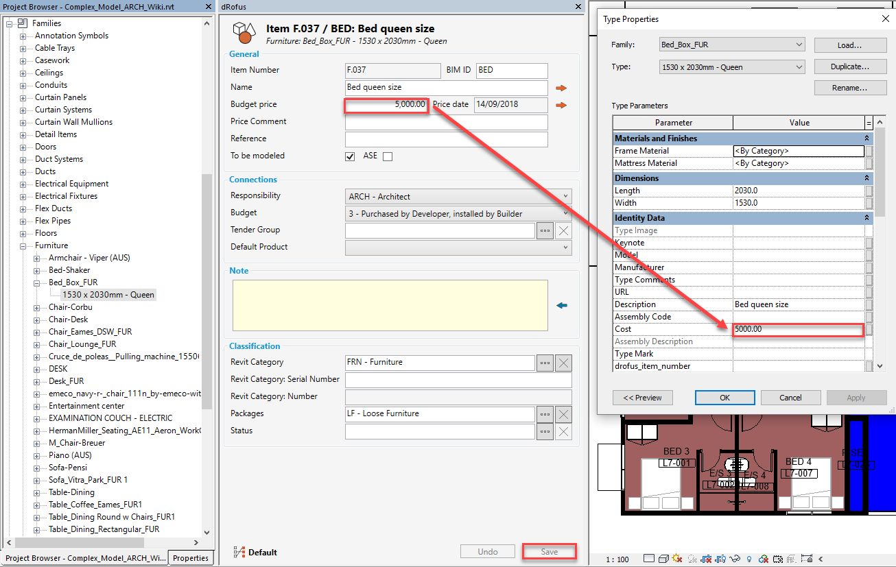Dans l'exemple suivant, si la valeur du prix du budget de dRofus est modifiée de "3 000,00" à "5 000,00" et que l'on clique sur "Enregistrer", la mise à jour sera également effectuée immédiatement dans le paramètre Revit Coût correspondant :