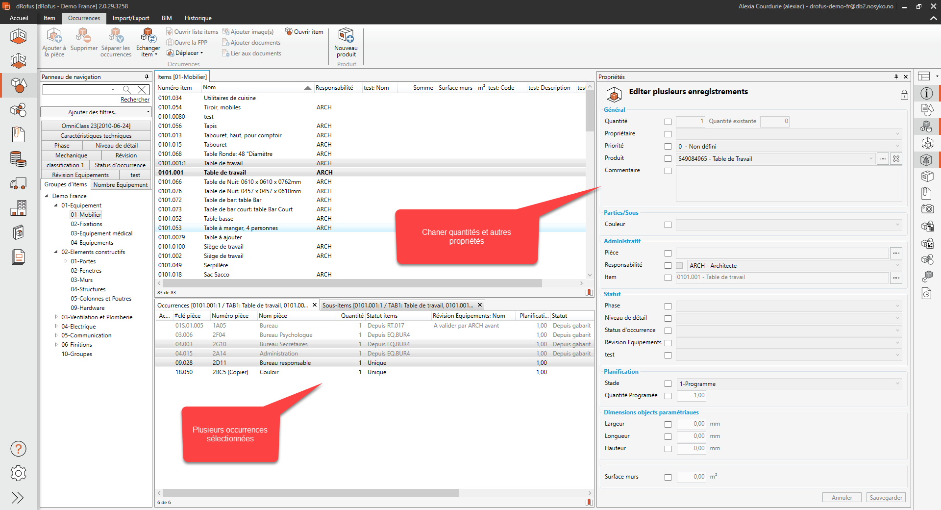 Pour modifier la quantité, la priorité et les autres données d'occurrences, vous pouvez sélectionner une occurrence et aller à Attributs. Vous pouvez éditer une ou plusieurs occurrence(s) en utilisant les touches Maj ou Ctrl pour sélectionner plusieurs occurrences dans le volet occurrences. Lorsque plusieurs occurrences sont sélectionnées, vous devez activer le champ à mettre à jour en cliquant sur la case à cocher à gauche du champ de données.