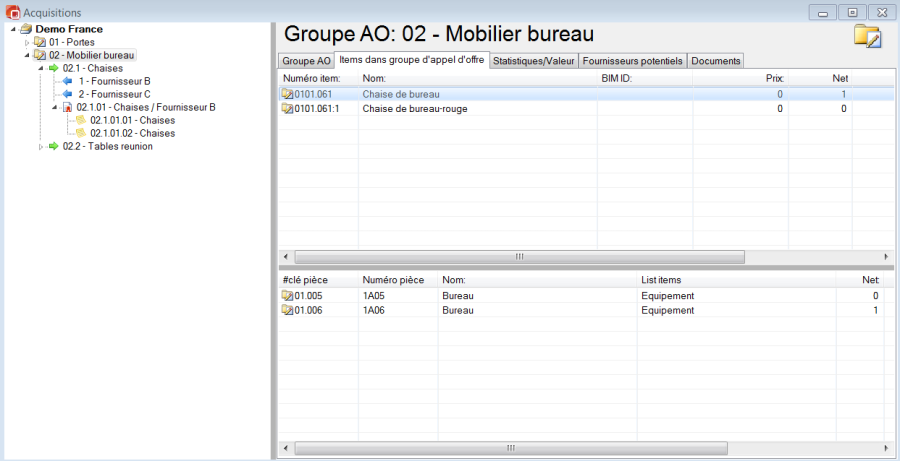 Le deuxième onglet affiche les items rattachés au groupe d'appels d'offres, avec le prix inscrit au budget et les quantités d'occurrences correspondant aux items individuels prévus. La fenêtre ci-dessous affiche les occurrences de la pièce individuelle. Vous pouvez double-cliquer pour ouvrir une liste des items et équipements prévus pour une pièce.