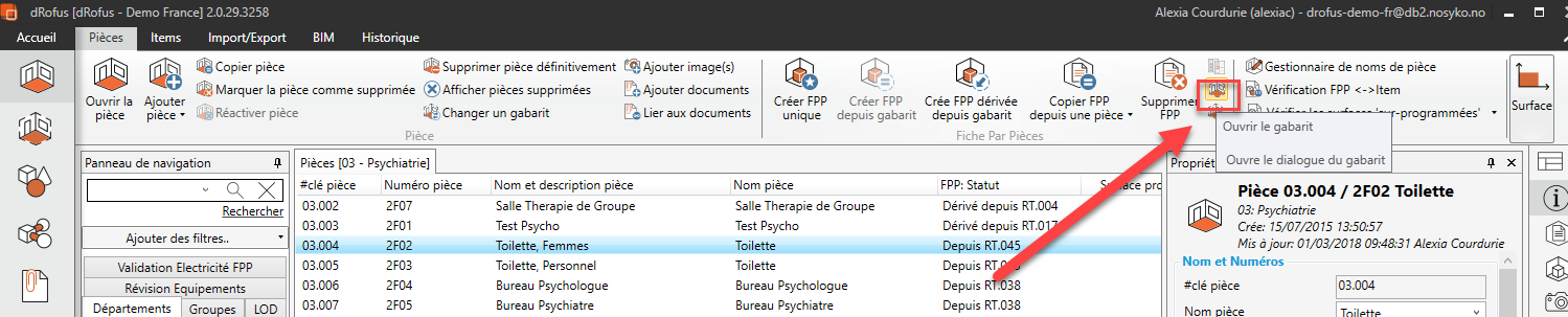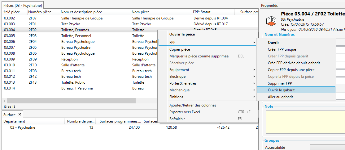 - Ouvrir depuis clic droit dans menu contextuel. Cliquez droit sur une pièce et sélectionnez Pièces → FPP → Ouvrir Gabarit;