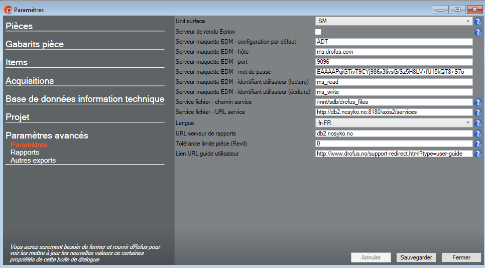 Ici vous pouvez définir les informations sur le projet comme par exemple les unités ou encore la langue.. Les points d'intérrogation vous renseignent sur l'utilisation des différents champs.