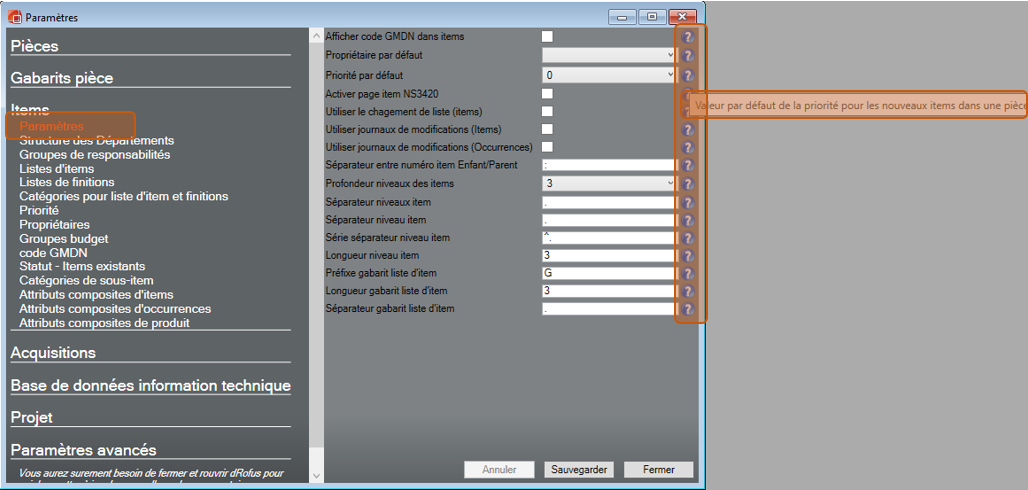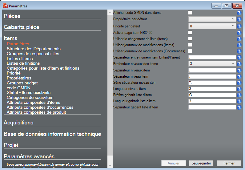 Paramètres items.