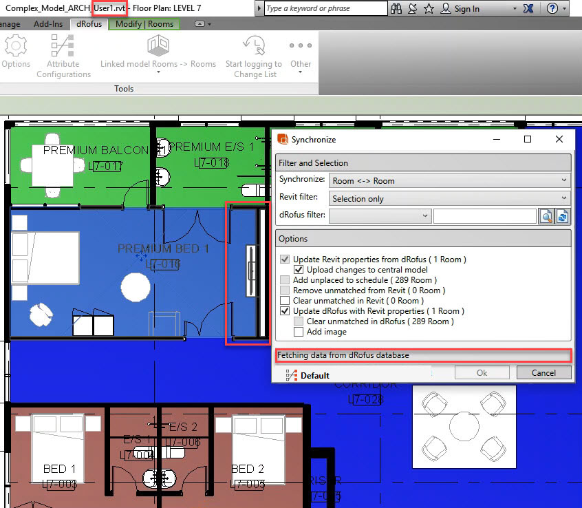 En cliquant sur "OK", la maquette est d'abord mis à jour avec les dernières informations, puis la synchronisation avec dRofus a lieu :