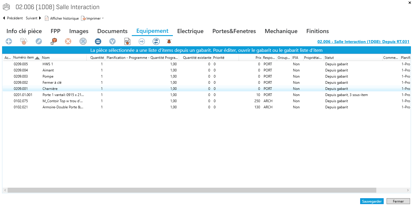 Pour ouvrir une liste d'équipements : À partir de la liste des pièces (Projet->Pièces) ou de la liste de gabarits de pièces (Projet->Gabarits de pièces),